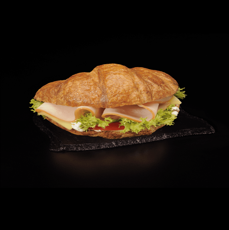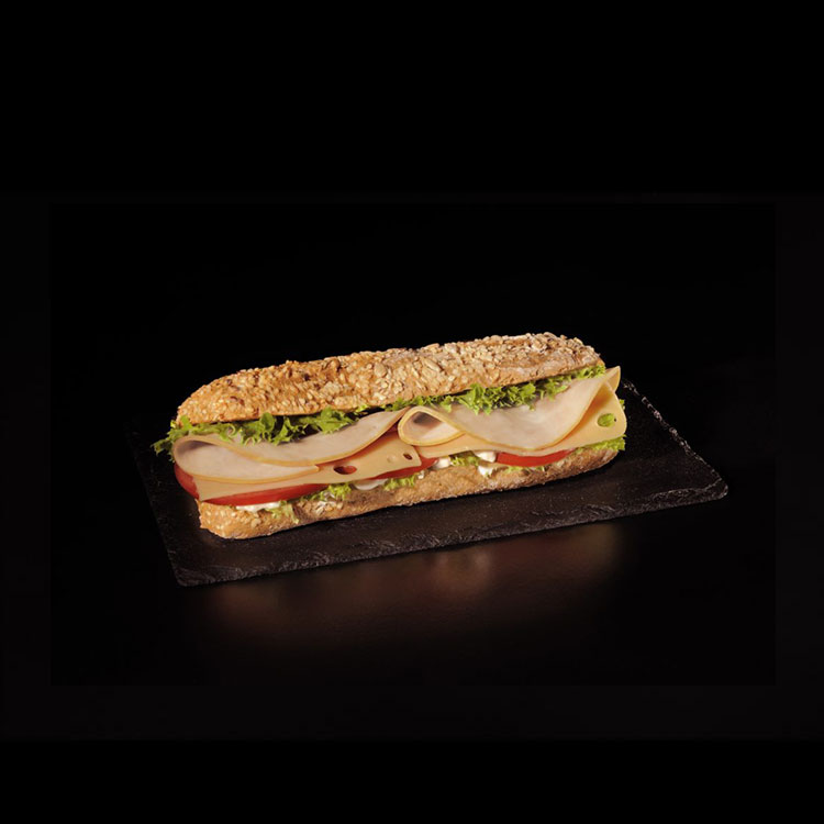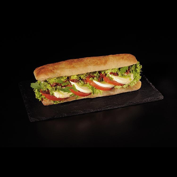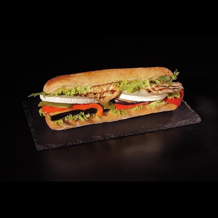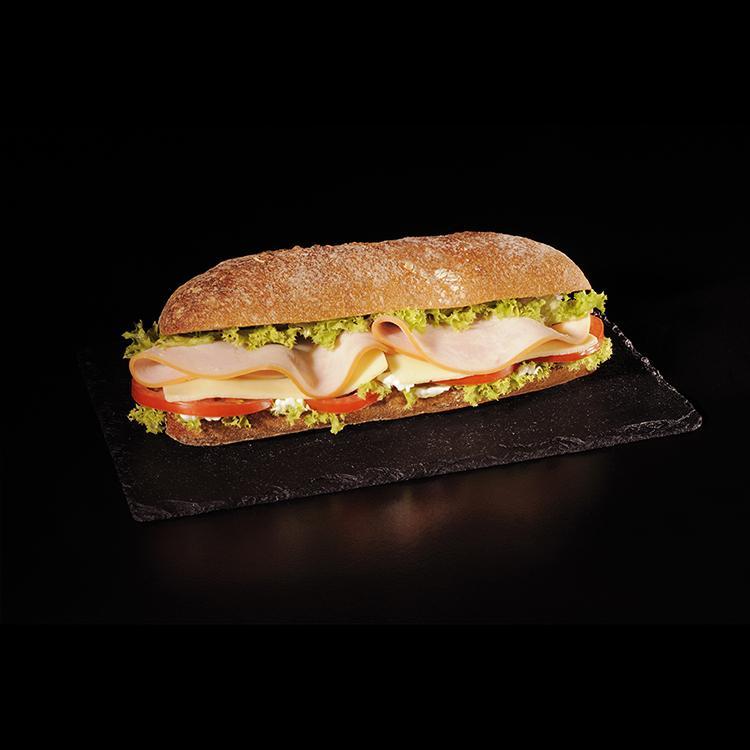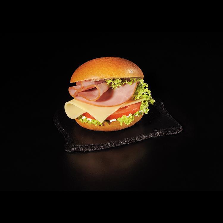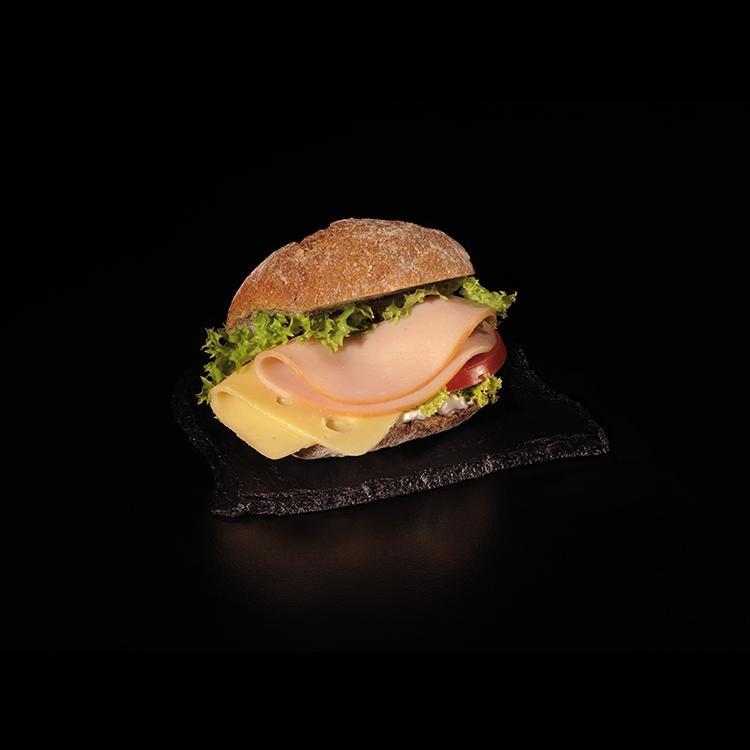 Ψωμί μπριός, κοτόπουλο, μπέικον, τυρί cheddar, μαγιονέζα, sweet chili, ντομάτα, iceberg. Συνοδεύεται με πατάτες country.