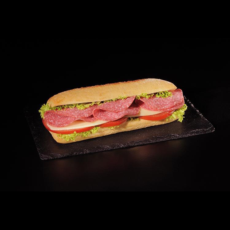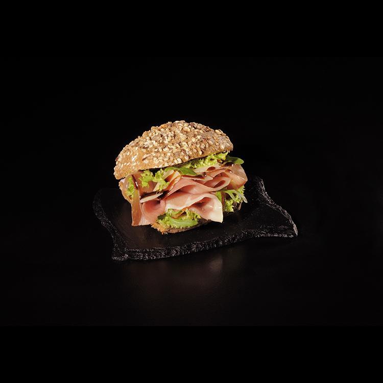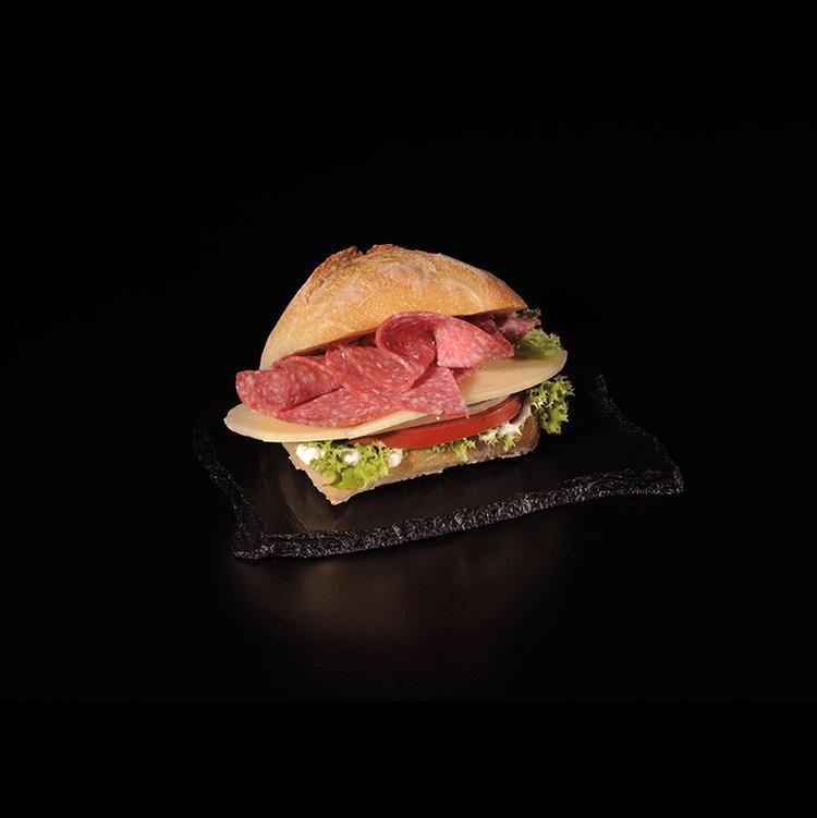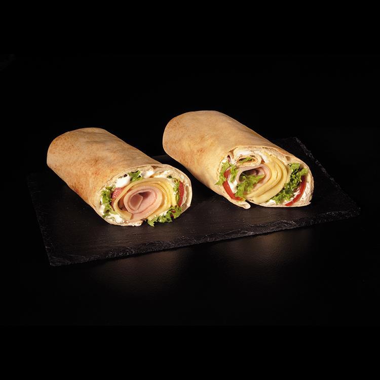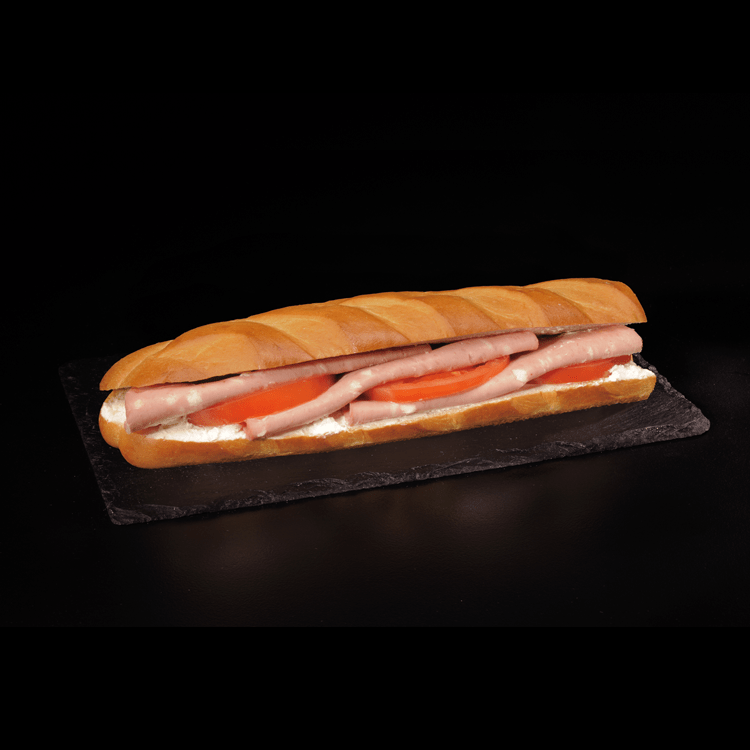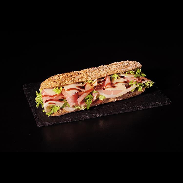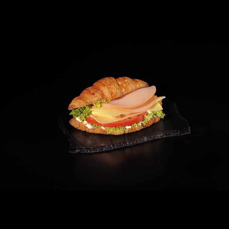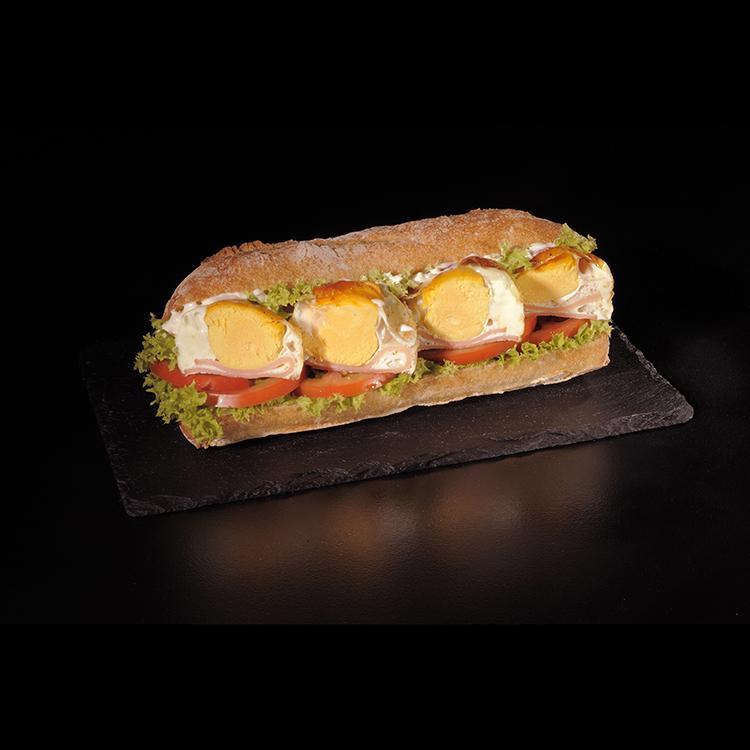 Ψωμί μπριός, κοτόπουλο, μπέικον, τυρί cheddar, μαγιονέζα, sweet chili, ντομάτα, iceberg. Συνοδεύεται με πατάτες country.