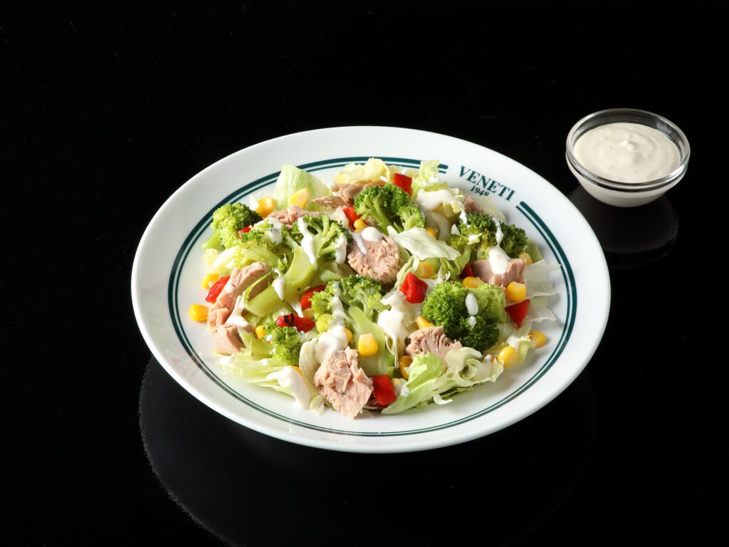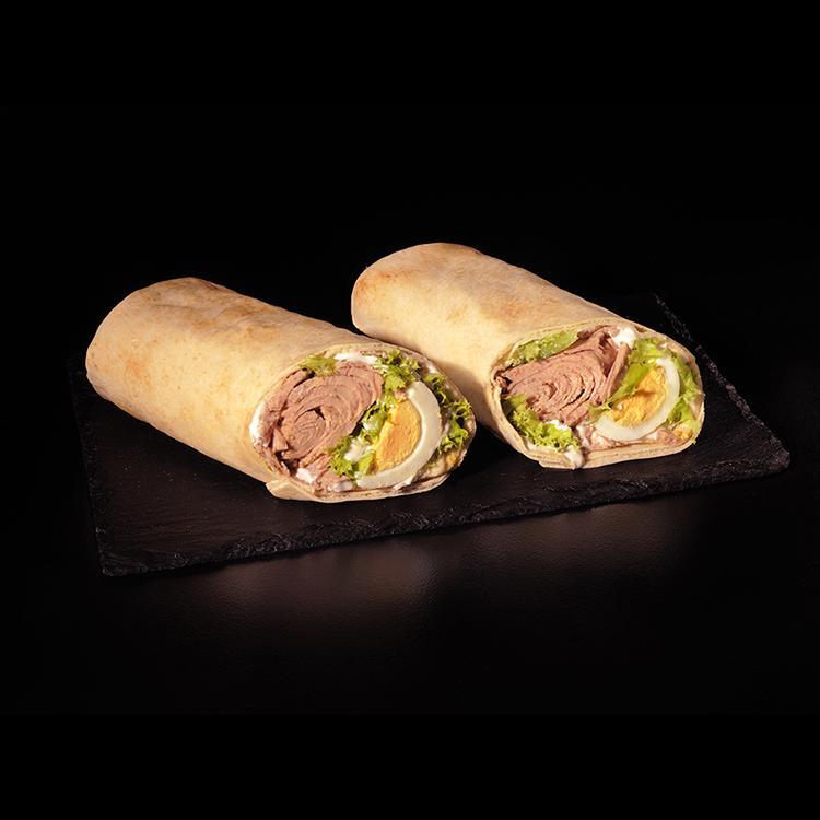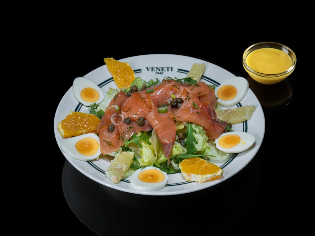 Ελαιόλαδο, γάλα, αλάτι, πιπέρι. Συνοδεύεται με ντοματίνια, iceberg και σως vinaigrette.
