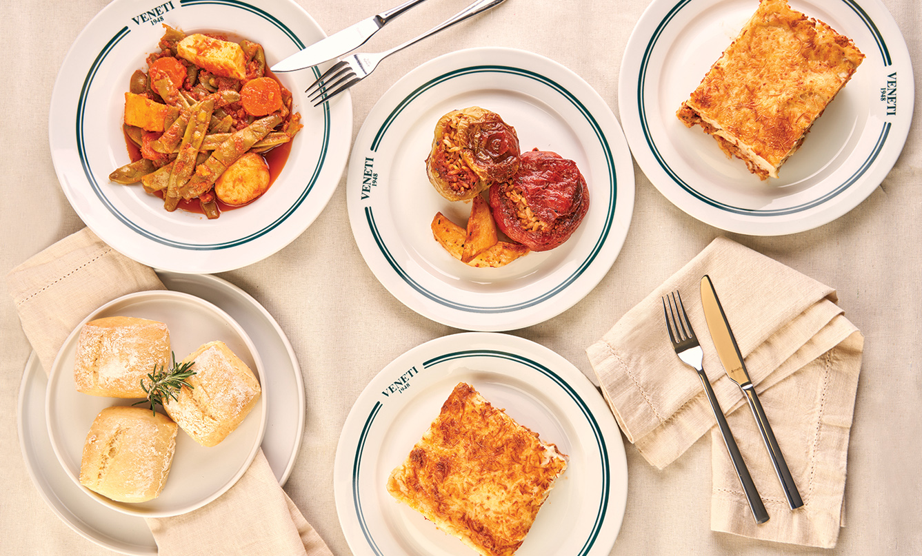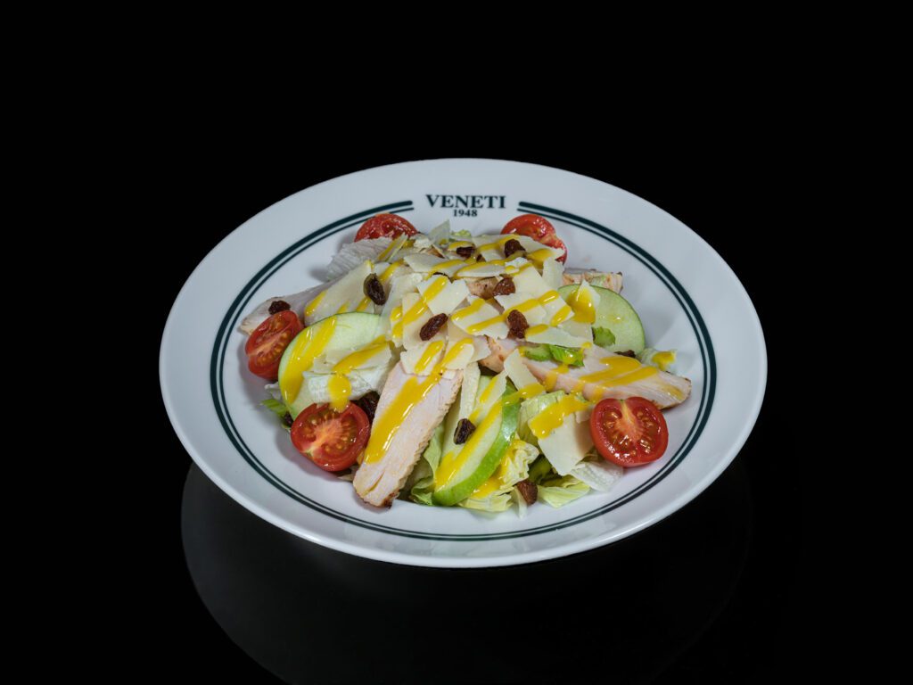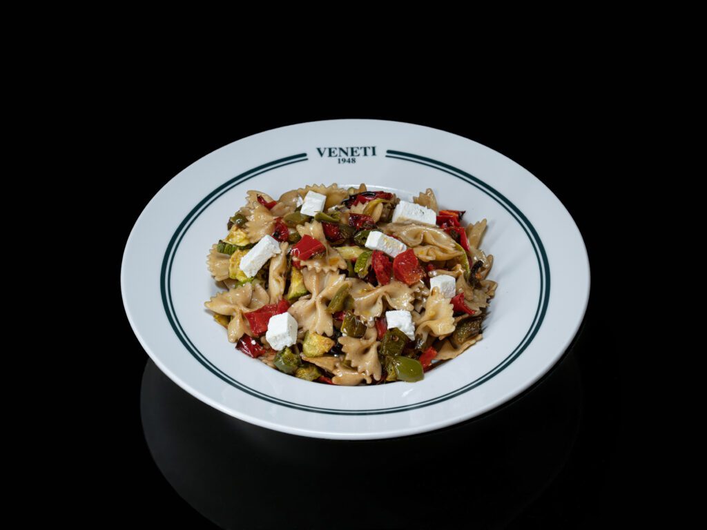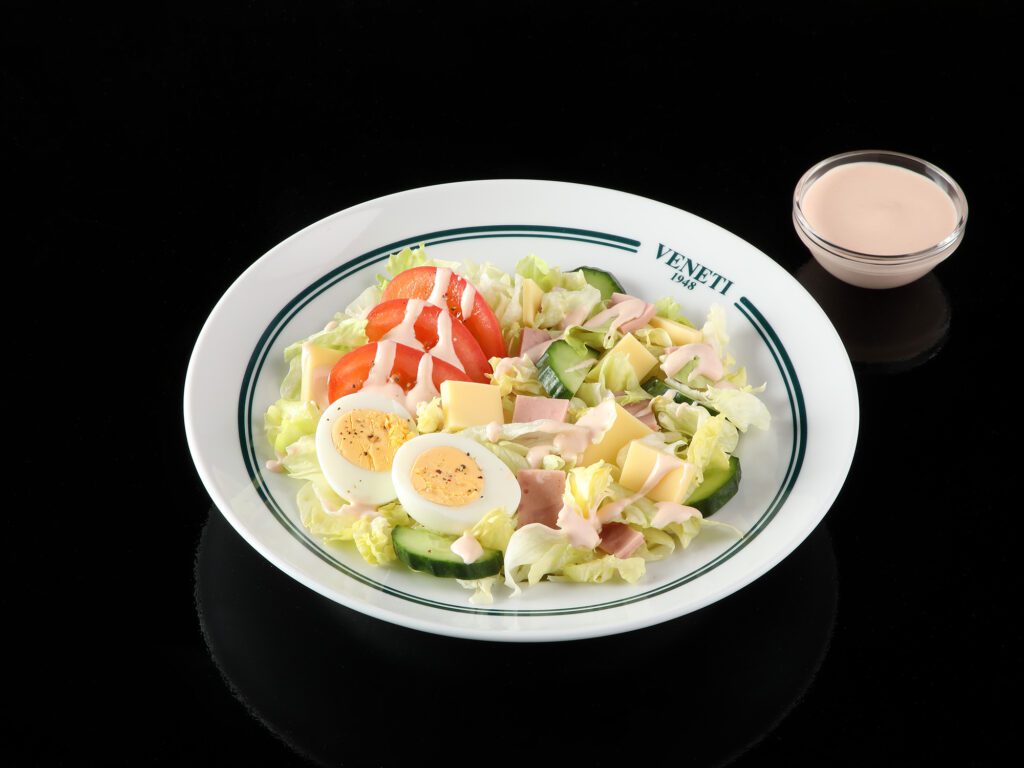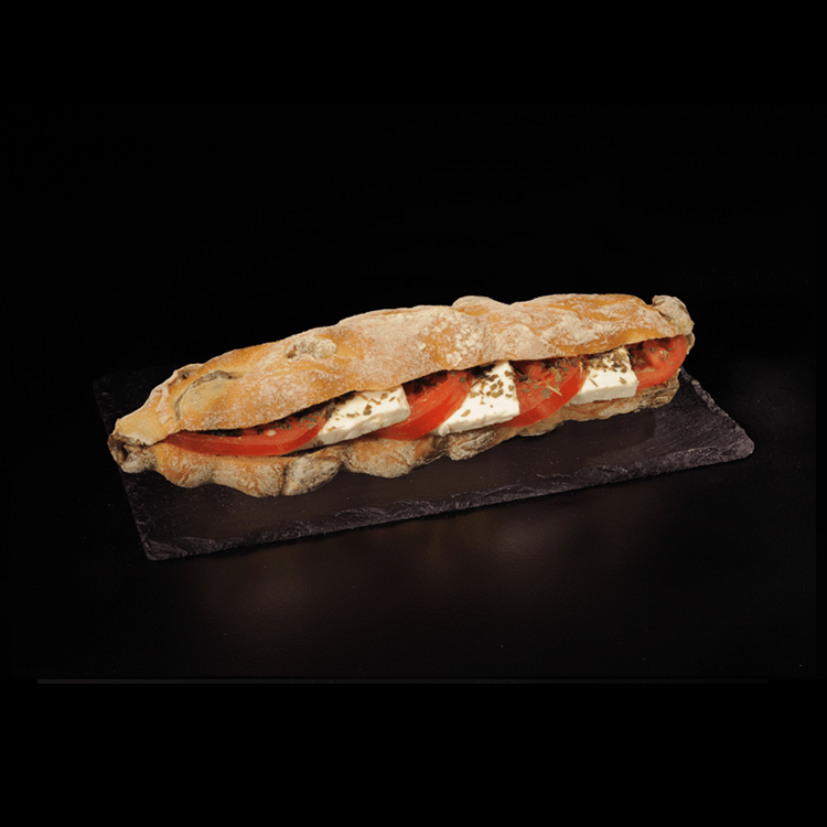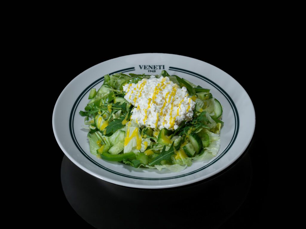 Τυρί φέτα, ντομάτα, πιπεριά πράσινη, γάλα, ελαιόλαδο, πιπέρι. Συνοδεύεται με ντοματίνια, iceberg και σως vinaigrette.