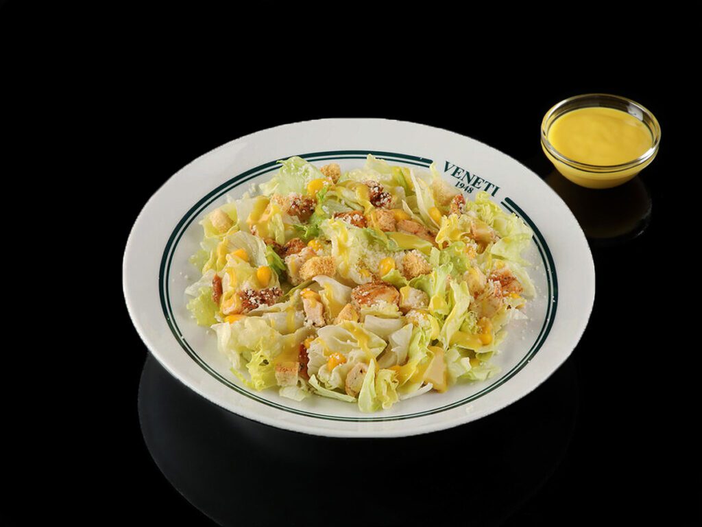 Τυρί γκούντα, κρέμα τυριού, παρμεζάνα, κοτόπουλο φιλέτο, μπέικον, καλαμπόκι, σάλτσα Caesar's
