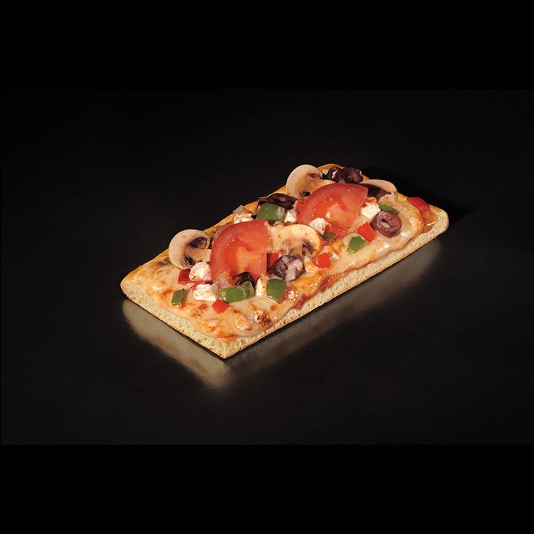 Σάλτσα ντομάτας, τυρί γκούντα, παρμεζάνα, ψητά λαχανικά (πιπεριές, μελιτζάνα, κολοκύθι, μανιτάρια), ελαιόλαδο